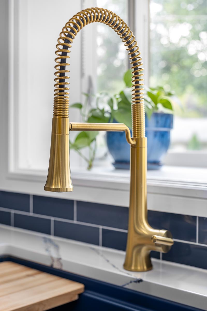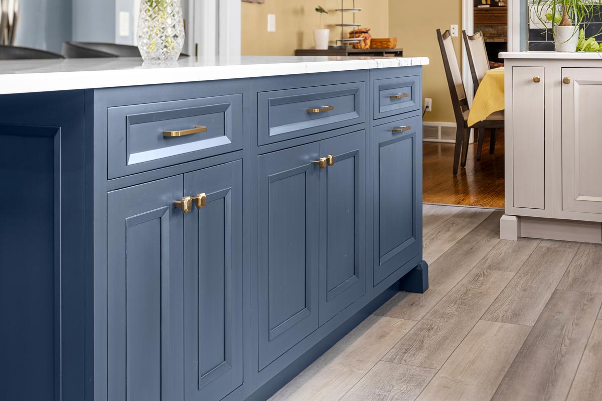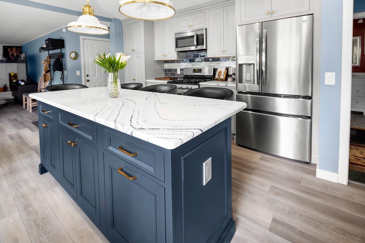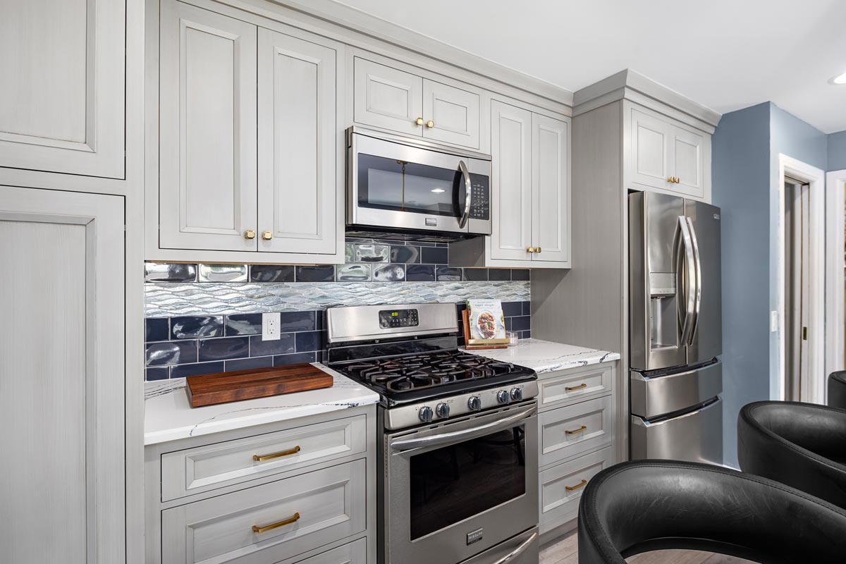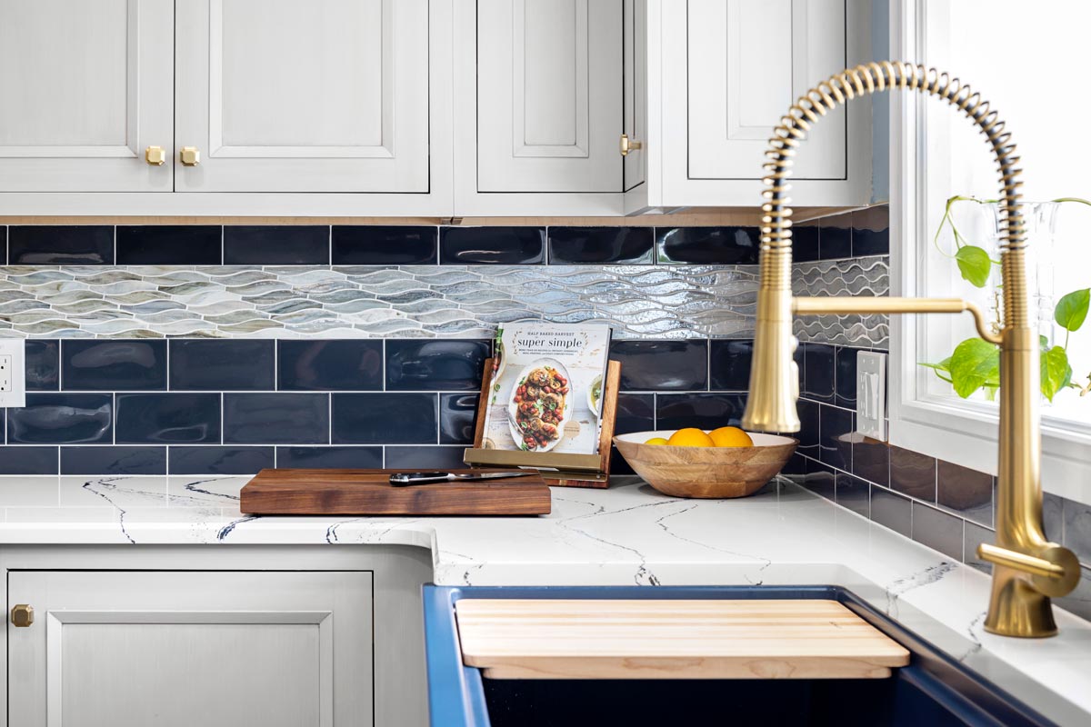 This Raven Court kitchen renovation in Bloomfield, MI pairs classic gray cabinetry with a bold blue island for a look that feels timeless yet distinctive. Quartz countertops, a navy farmhouse sink, and layered blue tile backsplash add depth, while brushed brass fixtures and thoughtful storage solutions enhance everyday functionality. The result is a bright, welcoming space designed for cooking, gathering, and entertaining.