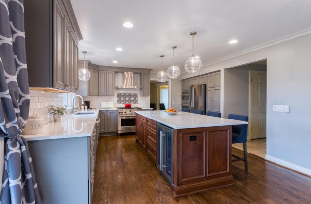 This Rochester Hills kitchen brings warmth and texture to a modern, open-concept layout. A rich wood island anchors the space, complemented by soft gray cabinetry, matte black hardware, and subtle stone-look surfaces. With expanded storage, custom details, and plenty of room to gather, it’s a renovation that effortlessly balances function and style.